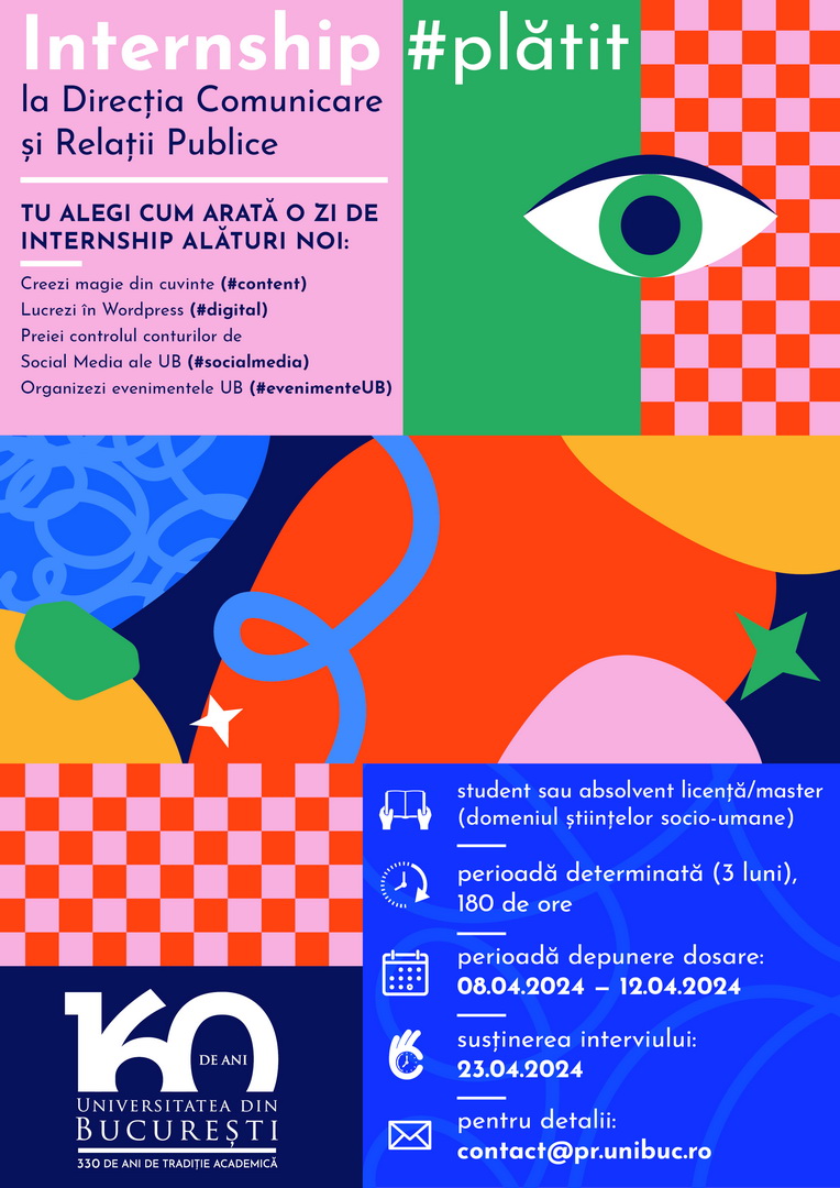 Perioada de depunere a candidaturilor este cuprinsă între 8 și 14 aprilie 2024, iar interviul va avea loc pe 23 aprilie 2023. 👀 Găsești toate detaliile pe www.unibuc.ro/student-ub/internship/programe-internship