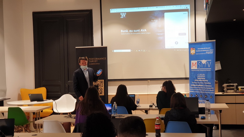 Cosmin OLTEANU, conferențiar universitar la Facultatea de Administrație și Afaceri și coordonator al programului de master Marketing Strategic și Managementul Vânzărilor – MSMV, a prezentat tendințele actuale privind folosirea platformelor de ecommerce in pandemie , sublinind impactul acestora asupra strategiilor de marketing. Studenții au fost împărțiți în echipe și au prezentat detaliat planuri de marketing, unde au implementat câte o componentă de AI.